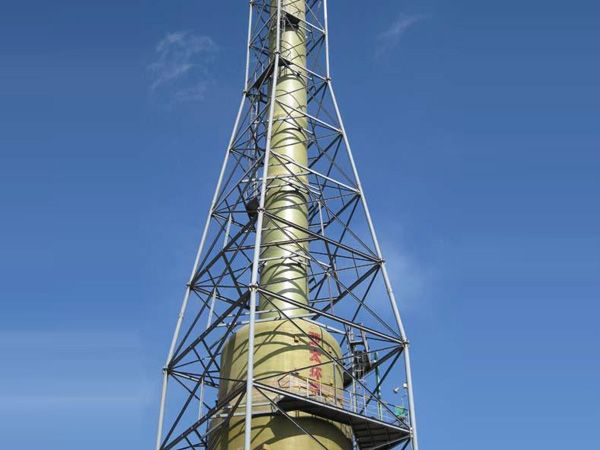 2、外套鋼結(jié)構(gòu)玻璃鋼煙囪形式 外套鋼結(jié)構(gòu)玻璃鋼煙囪一般設(shè)計(jì)高度在100米以下,一般設(shè)計(jì)都是和脫硫塔合起來。煙囪直接放在脫硫塔的出口上。這種煙囪的設(shè)計(jì)不需要分段,煙囪的重量可以直接傳到脫硫塔上,也可以設(shè)計(jì)把煙囪重量傳到鋼架上。